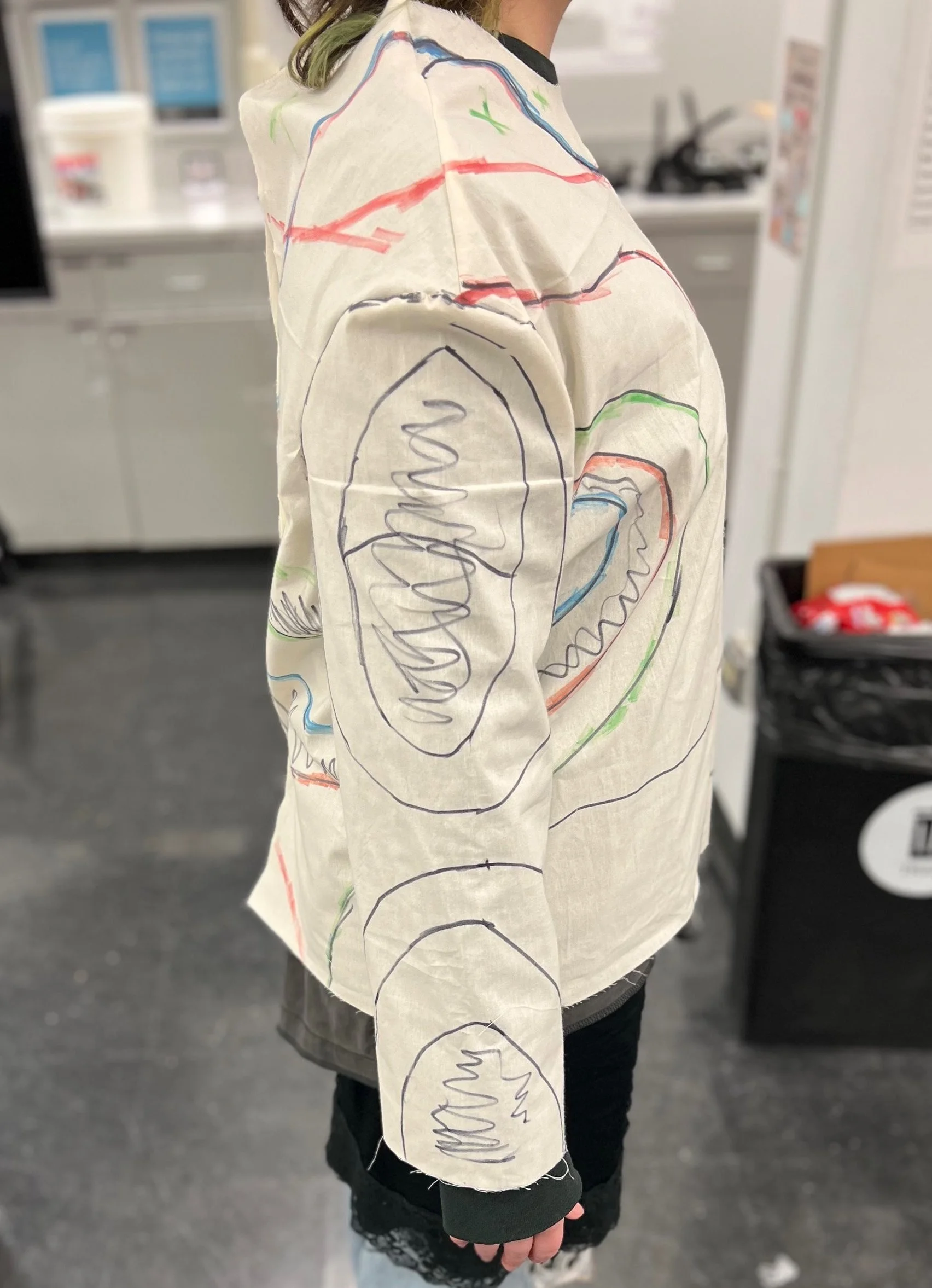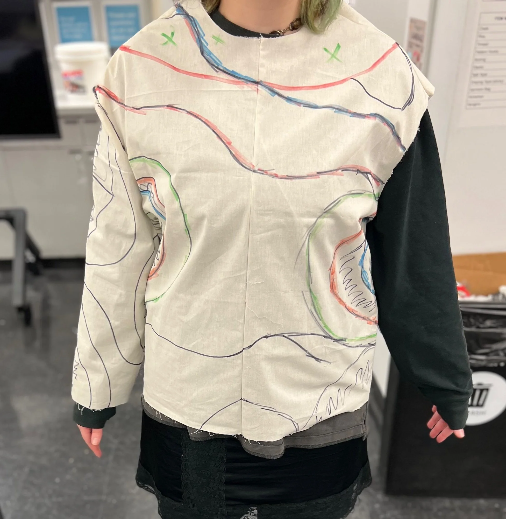 We were tasked with creating a t-shirt inspired by RuPaul’s Drag race winner, Shea Coulee. It didn’t matter the design of the shirt, the only requirement was that we work with knitted fabrics to expand our knowledge of how fabrics act when cut sewn together. I started by sketching basic T-shirt and making small alterations and then larger alterations. I wasn’t too enthused about most of the design until a happy mistake during peer reviews.